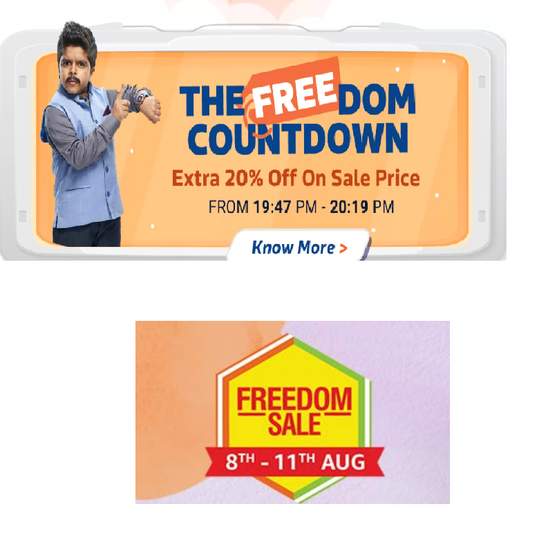 | Freedom Sale | Amazon.in | August 8 midnight-August 12, 2019 | August 7, 12 noon- August 12, 2019 for Amazon Prime members | 10% instant discount with SBI Credit cards |